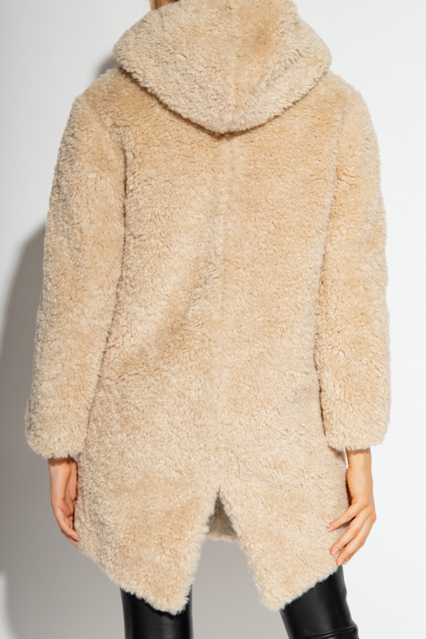 Cream ‘Iggy’ hooded shearling jacket from Rag & Bone. Fastened with decorative buttons, this long sleeve design features two slip pockets.
