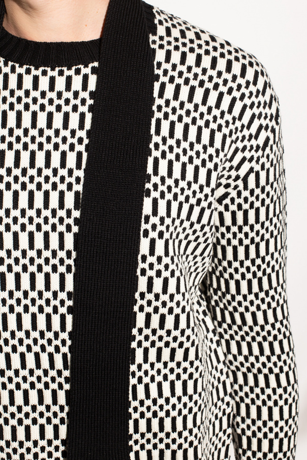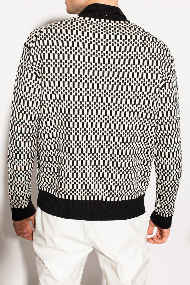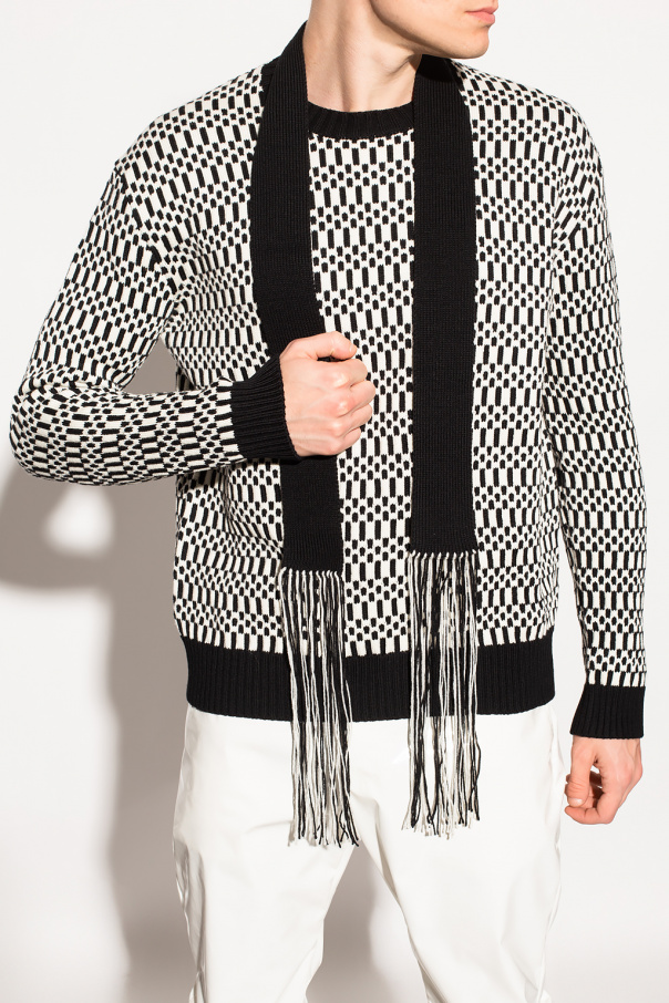 Black and white crewneck sweater from JIL SANDER. Crafted from wool, this style showcases a geometrical pattern, ribbed trims on the collar, bottom hem and cuffs and an attached scarf with fringes.