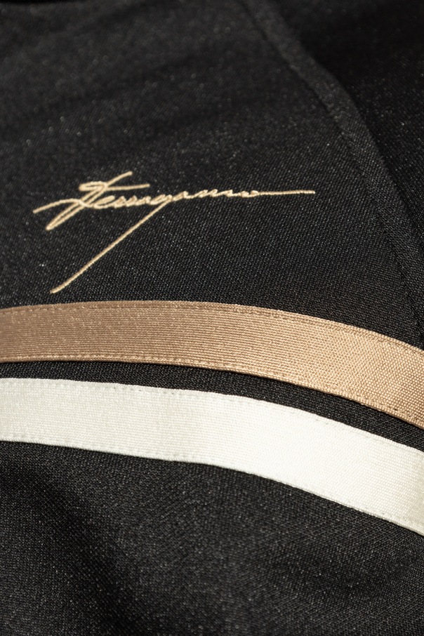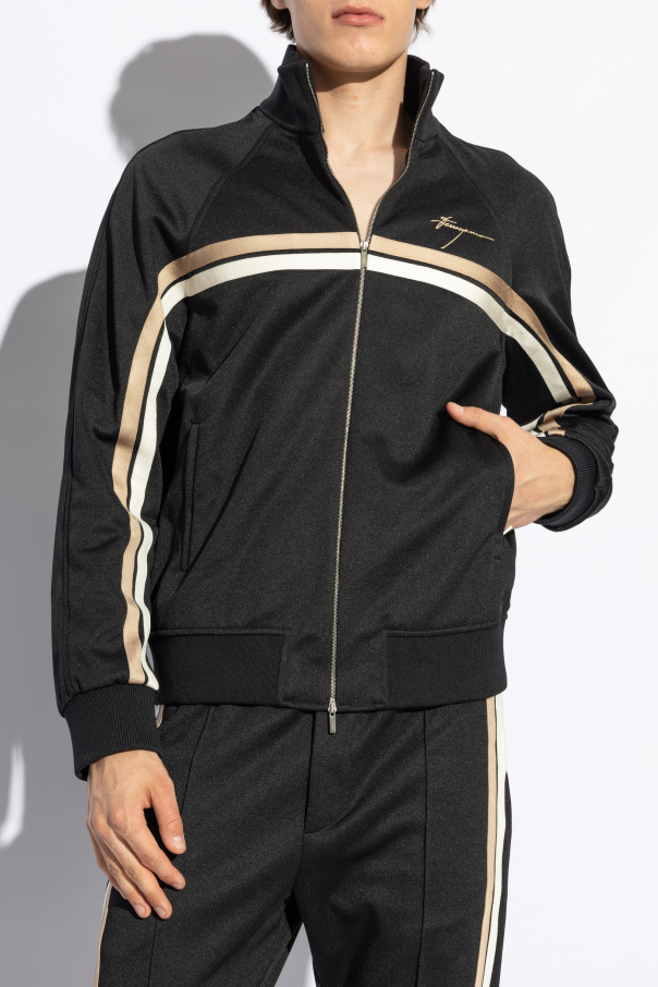Introducing an exquisite addition to our exclusive collection: the Black Zip-Up Sweater with Logo by FERRAGAMO. Crafted with a discerning blend of polyester and cotton, this piece epitomizes the fusion of luxury and sporty aesthetics. Its sleek black hue is elegantly contrasted with decorative stripes in beige and white on the sleeves, while the high-neck design adds a touch of sophistication. The sweater\'s allure is further accentuated by the golden FERRAGAMO logo adorning the left chest, a symbol of unparalleled luxury. Ribbed cuffs and hem ensure a snug fit, enhancing the garment\'s comfort and silhouette. Additionally, the presence of a dual-directional zipper and two front zippered pockets integrate functionality with style, making this piece not only a statement of fashion but also of practicality. The subtle placement of the golden logo on the back, near the hem, harmonizes with the garment\'s design, offering a discreet yet unmistakable nod to the brand\'s signature elegance. This sweater, part of a zip-up ensemble, stands out for its sophisticated simplicity and the meticulous attention to detail. Why Purchase This Product? Exclusive Design: A unique piece from the FERRAGAMO collection, showcasing a luxurious sporty look. Premium Materials: Made from a blend of polyester and cotton for ultimate comfort and durability. Functional Elegance: Dual-directional zipper and zippered pockets blend utility with style. Distinctive Details: The contrast of the decorative stripes and the golden logo elevates the garment\'s exclusivity.