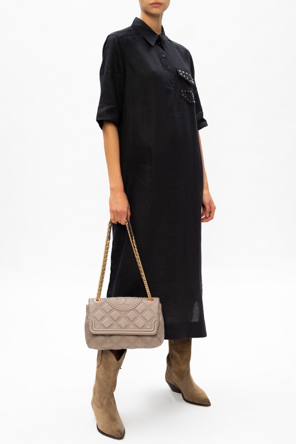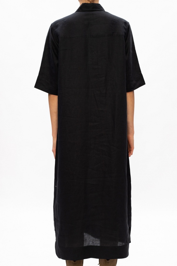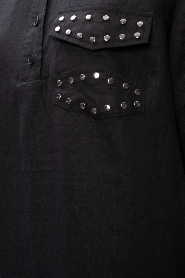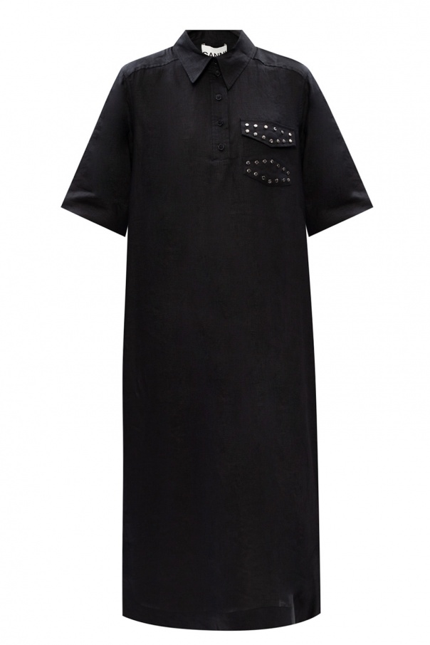 Navy blue dress from Ganni. Punctuated with silver-tone studs, this linen-crafted piece fastens via buttons and employs pointed collar, button closing and two buttoned flap pockets on the front.