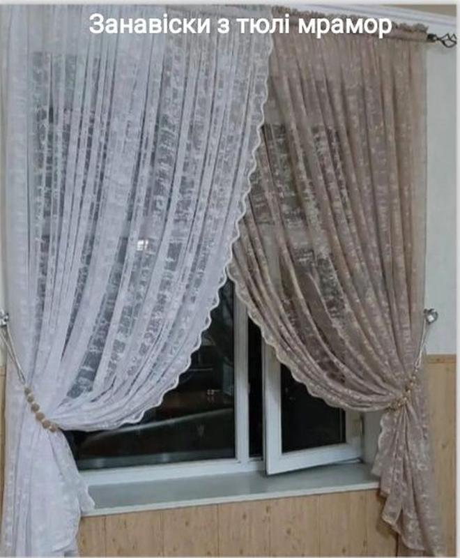 Красиві занавіски з сучасної тюлі під мрамор на різну ширину карнизу. В наявності є декілька кольорів: білий, молочний, сірий, хакі. Тканина м"яка, не потрібно прасувати після прання.