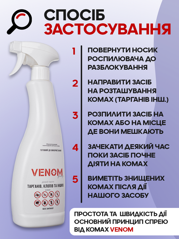 4 **Безопасность для детей и домашних любимцев:** Venom spray разработан с учетом вашего комфорта и безопасности. Он безопасен для использования дома, не имеет запаха и не оставляет следов. Дополнительно, не является агрессивным к детям и животным.