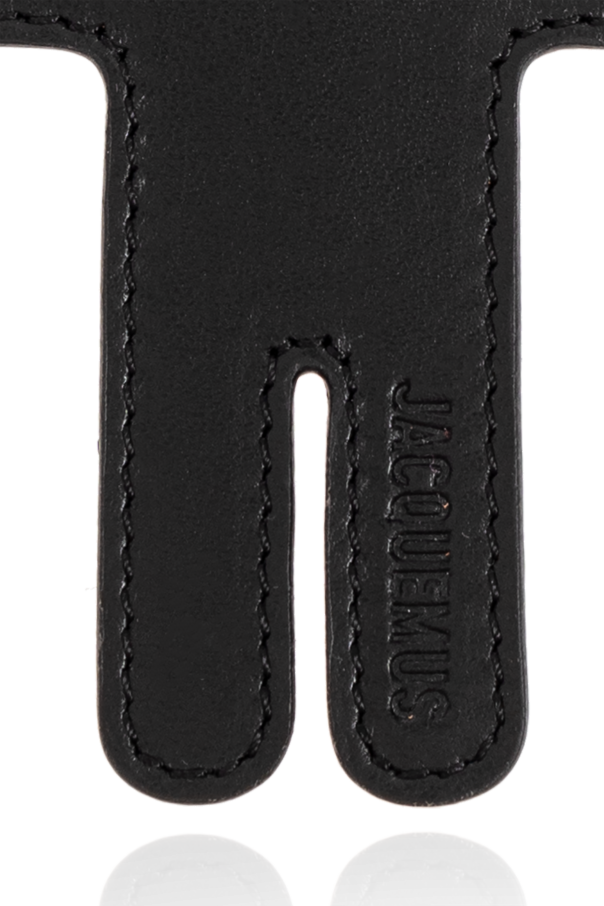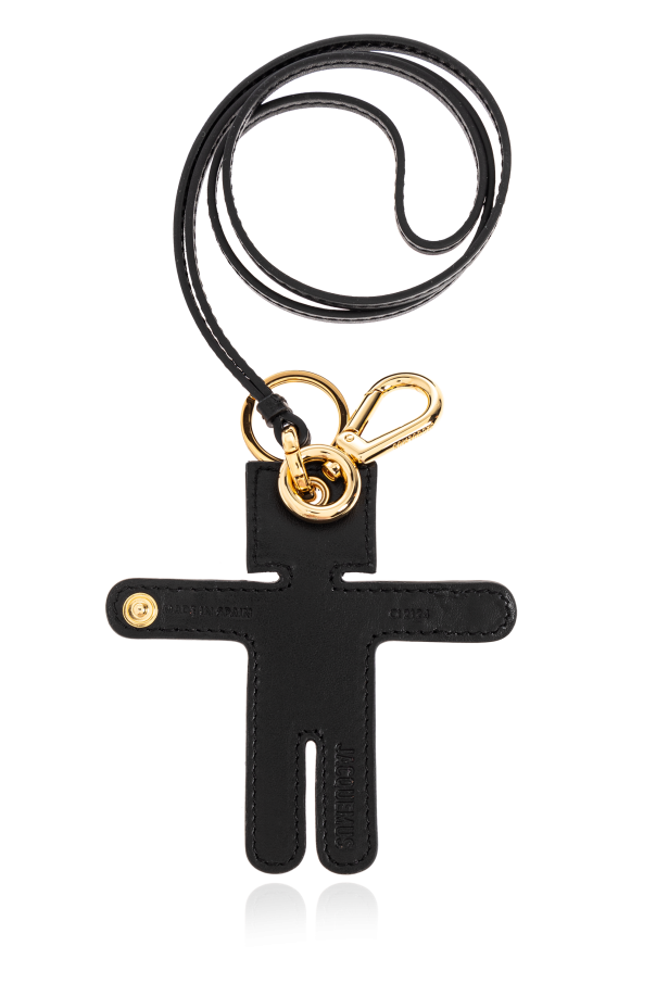 Introducing the Leather Keychain by Jacquemus, a sublime embodiment of elegance and modernity. Crafted from exquisite black leather, this keychain is a testament to luxury and sophistication. Its unique shape, a stylized figure with outstretched arms, captures a contemporary and minimalistic aesthetic. Adorned with golden metal accents, including a meticulously engraved carabiner and rings, this accessory exudes both elegance and utility. The brand\'s name \"Jacquemus\" is embossed on one leg, while the carabiner showcases an engraved logo, adding a touch of exclusivity. Functionality meets style with a long black strap, enabling it to be worn around the neck. Designed as a unisex piece, this keychain is perfect for anyone seeking a blend of practicality and decoration. Why purchase this product? Luxurious black leather construction Unique, modern design with stylized figure Elegant golden metal details Unisex appeal for versatile usage Includes a convenient long strap for wearability
