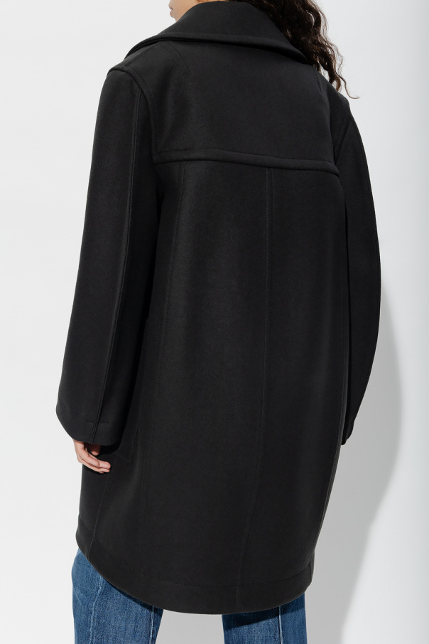 Dark green double-breasted coat with notch lapels from Bottega Veneta. Made of wool, this long sleeve design features buttons and four front pockets.
