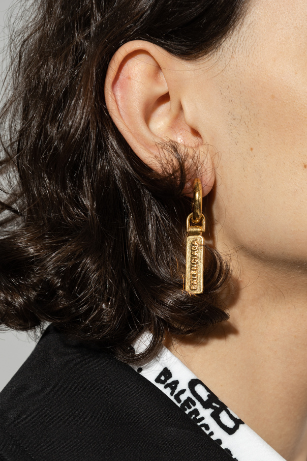 Gold-tone hoop earrings from Balenciaga. Made of brass, they secure with snaps and showcase logo-engraved charms.
