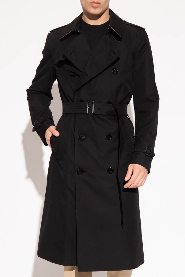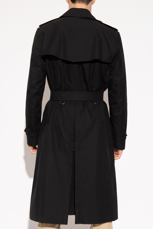 Black ‘Kensington’ long coat from Burberry. Made of cotton, this style features a double-breasted silhouette with button fastenings, a waist-cinching belt, shoulder epaulettes, a buttoned storm flap on the front, two slip pockets, a single back vent and long sleeves with button cuffs.