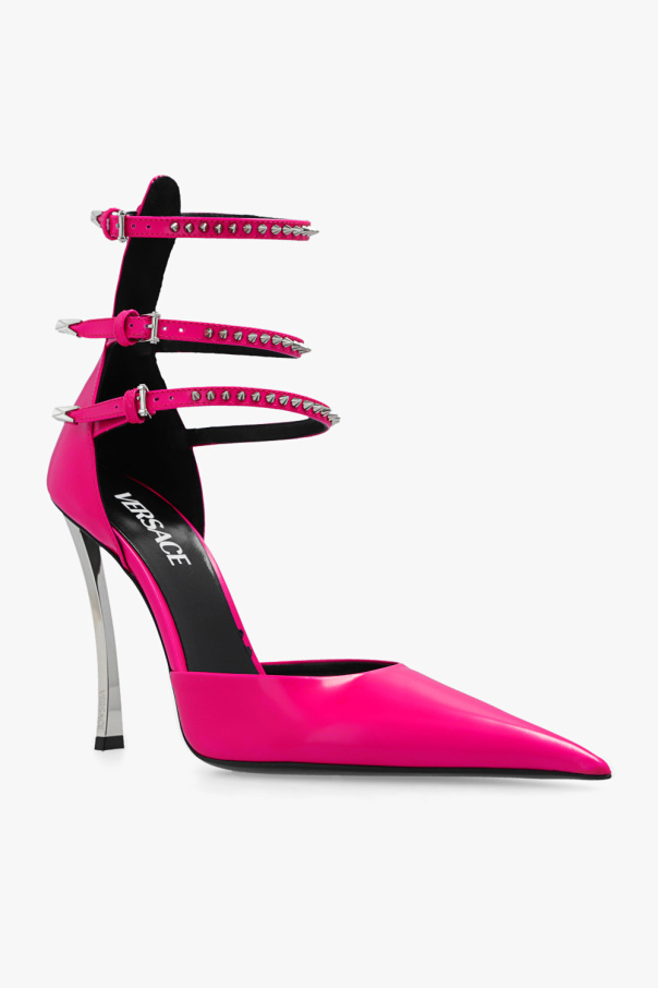 Pink pumps from Versace. Made of leather, this model sits on a black leather sole and features a pointed toe, a decorative silver-tone heel with a logo and and three straps with silver-tone buckles, stud embellishments and 'V' hardware.