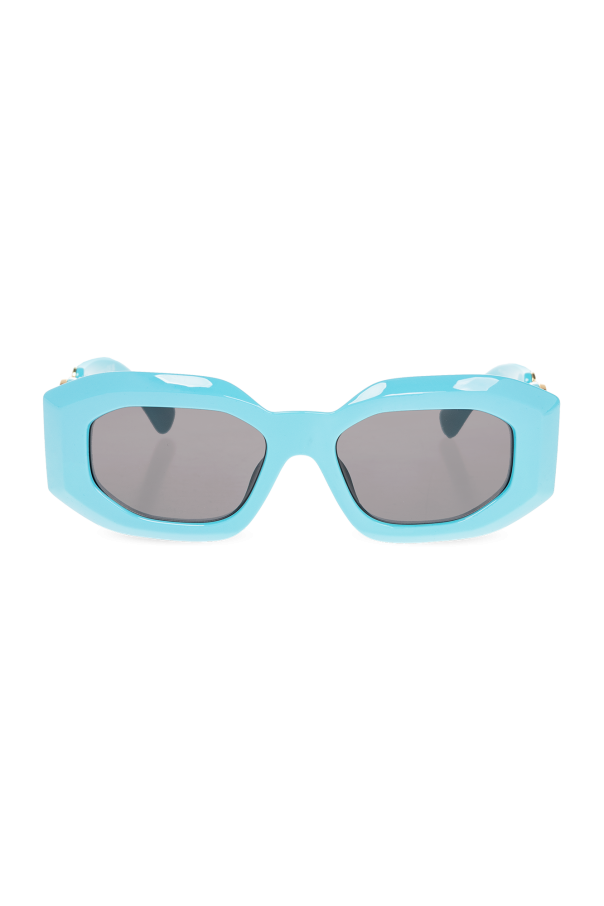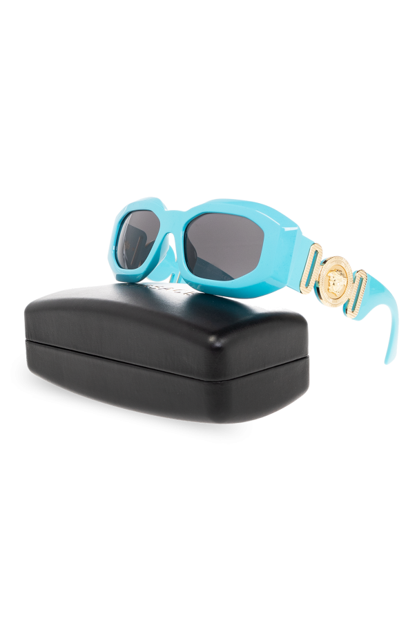 Blue sunglasses from Versace, ‘La Vacanza’ collection. This pair features a thick frame with a single bridge and integrated nose pads, temples with the brand’s signature Medusa head detail in gold-tone and grey lenses with UV protection. Case included.