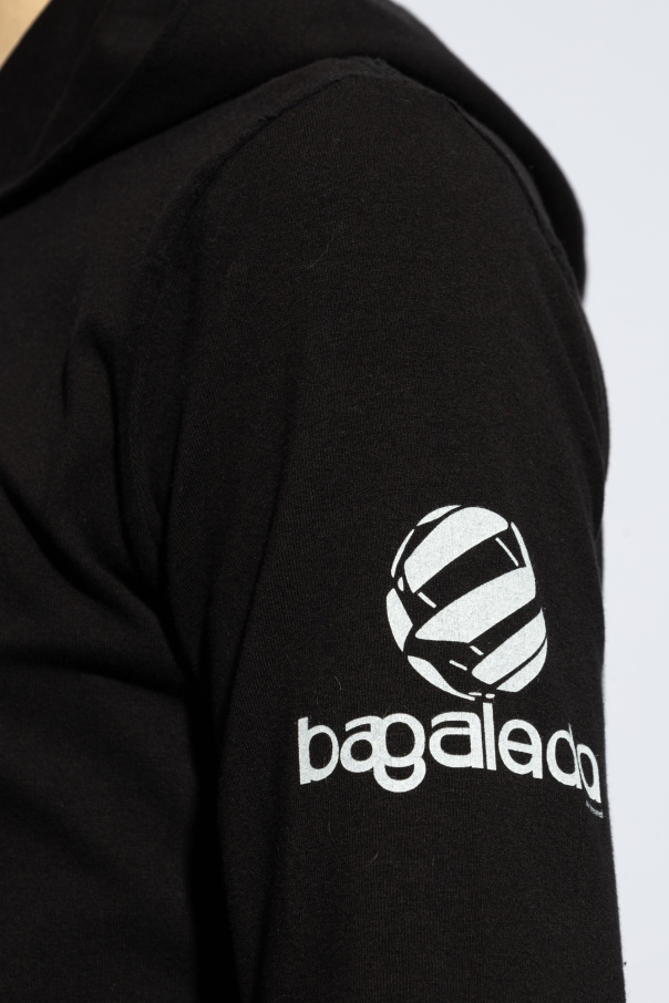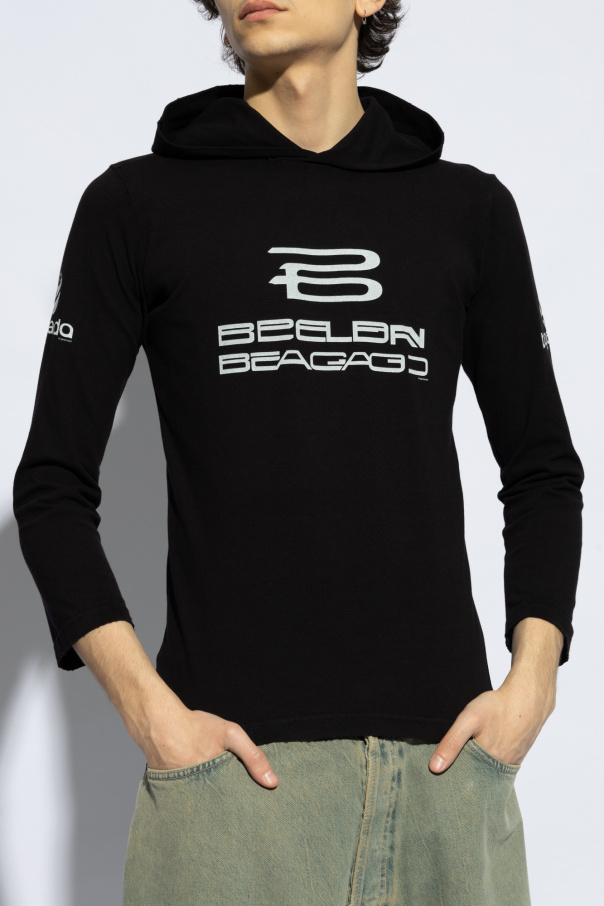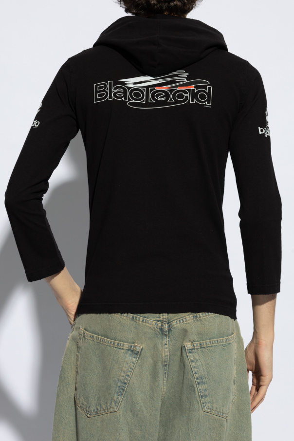 Black hooded T-shirt with a worn effect from Balenciaga. Made of cotton, this long sleeve garment features a logo print designed with the help of an artificial intelligence algorithm programmed to pull from the brand’s wealth of iconic logos.