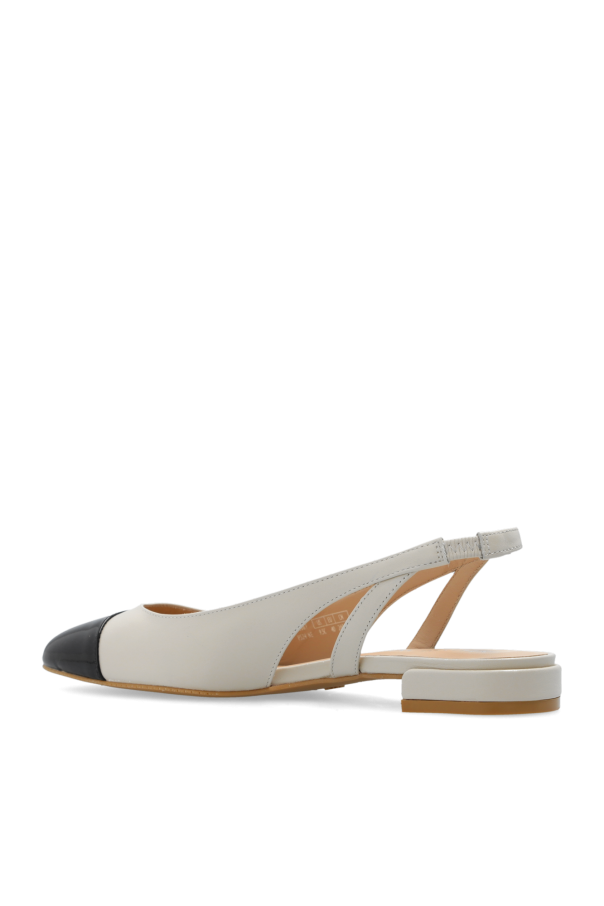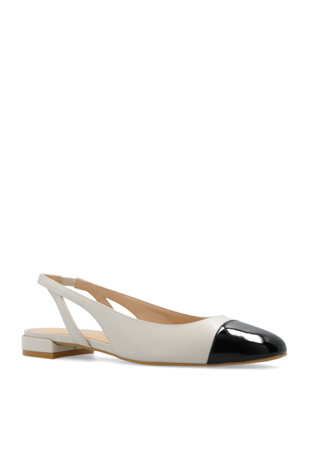 Cream ‘Sleek’ shoes from Stuart Weitzman. Made of leather, this model sits on a beige rubber sole and features an elasticized slingback strap and a gloss black toe.