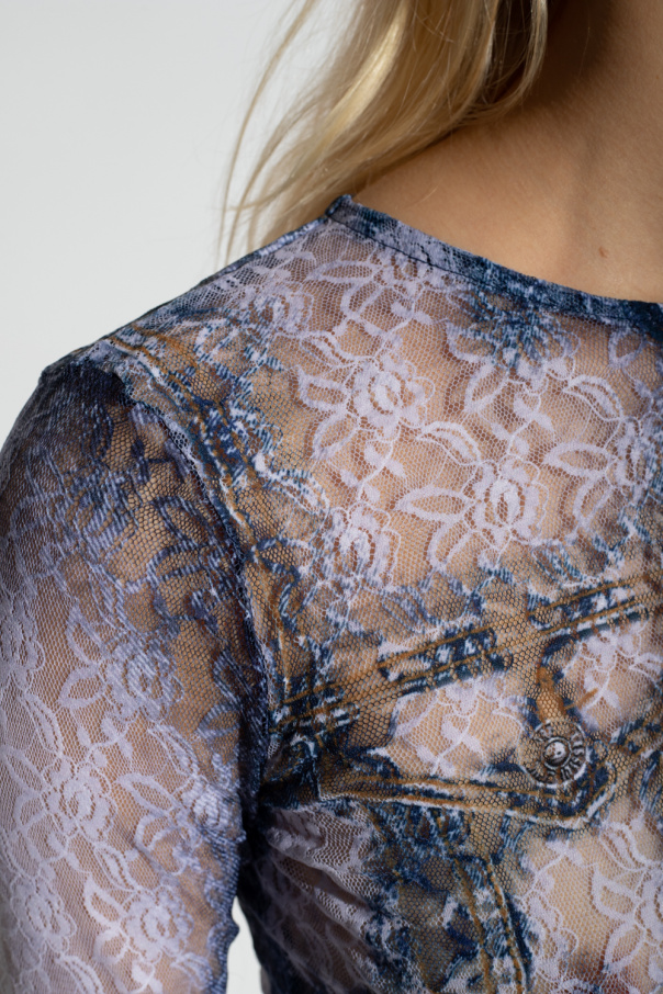 Blue and white ‘T-CILL’ top from Diesel. Crafted from Italian lace with a trompe l\'oeil print of vintage denim, this style features a trimmed round neck and long sleeves.