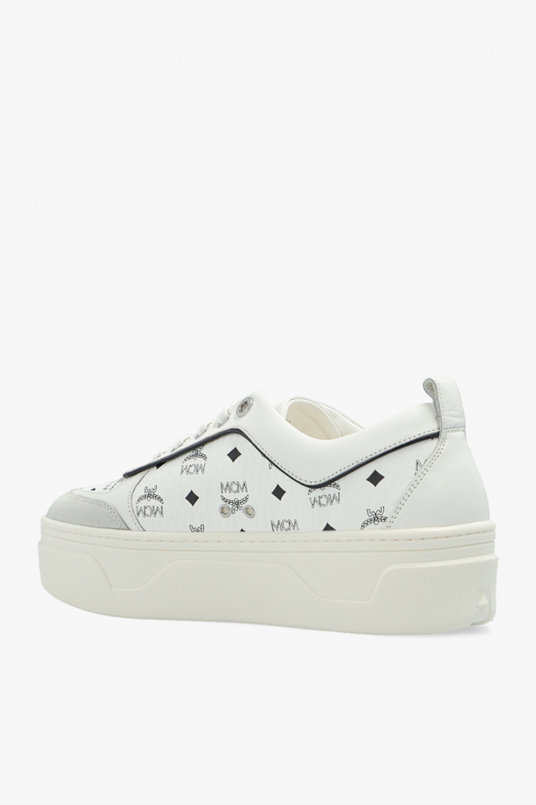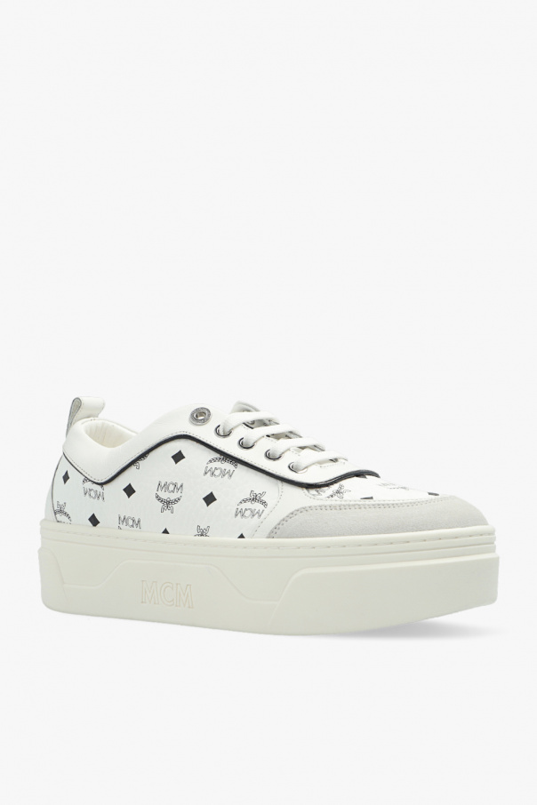 White ‘Skyward’ platform sneakers from MCM. Made of leather, this lace-up model sits on a white rubber sole and showcases a printed black ‘Visetos’ monogram.