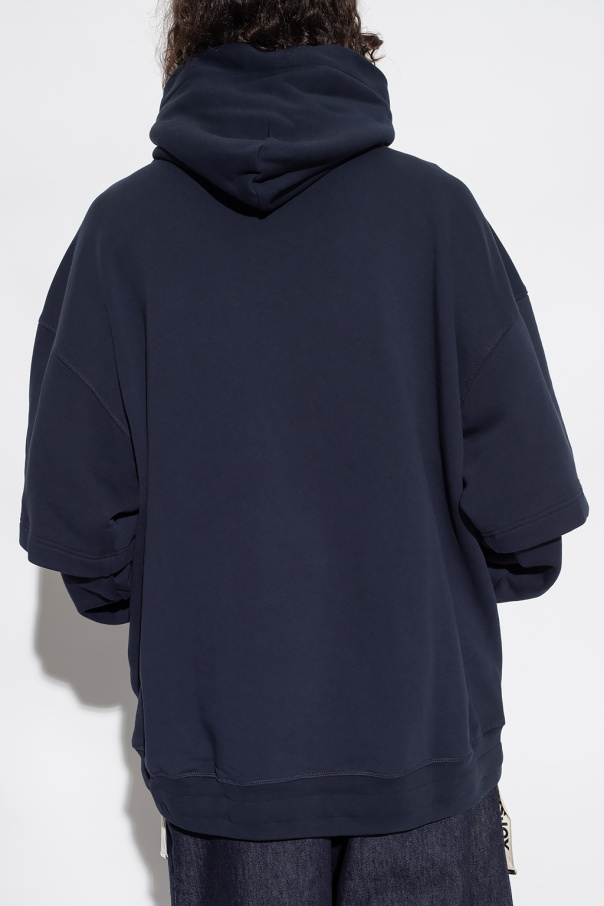 Navy oversize hoodie from KHRISJOY. Made of cotton, this design features a hood with snap fastening, front pocket, long sleeves with ribbed cuffs and white logo-printed drawstrings at the hem.