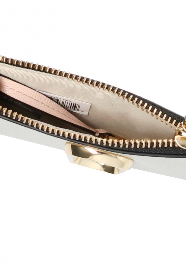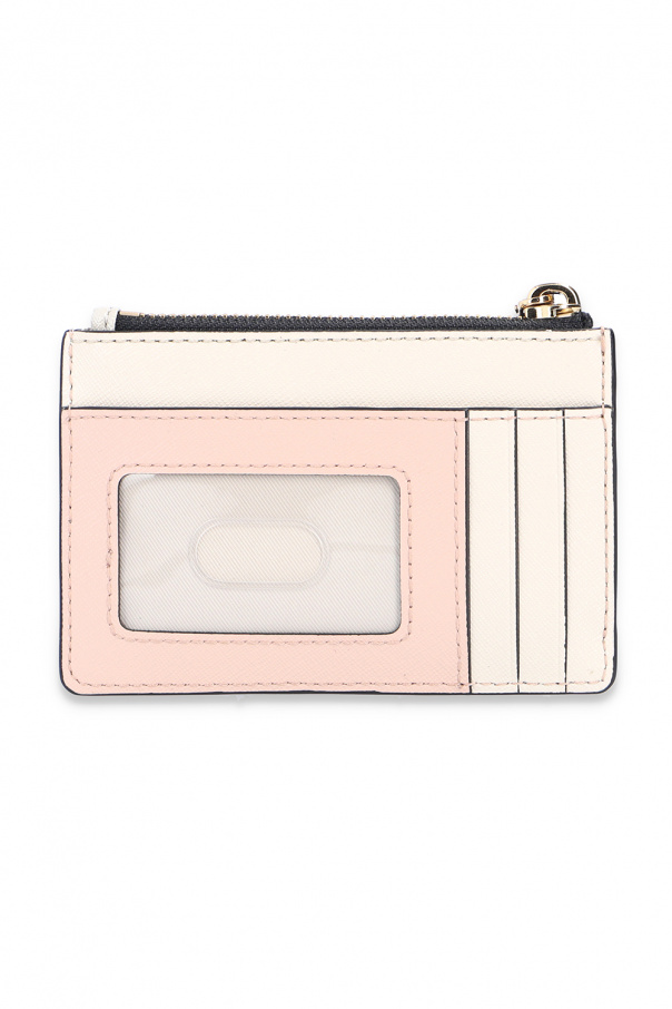 Grey, cream and pink key holder from Marc Jacobs (The). Made of leather, this item fastens with a zip and features a logo appliqué, four card slots, one slip pocket, gold-tone metal hardware and one internal compartment with a keyring on a strap.