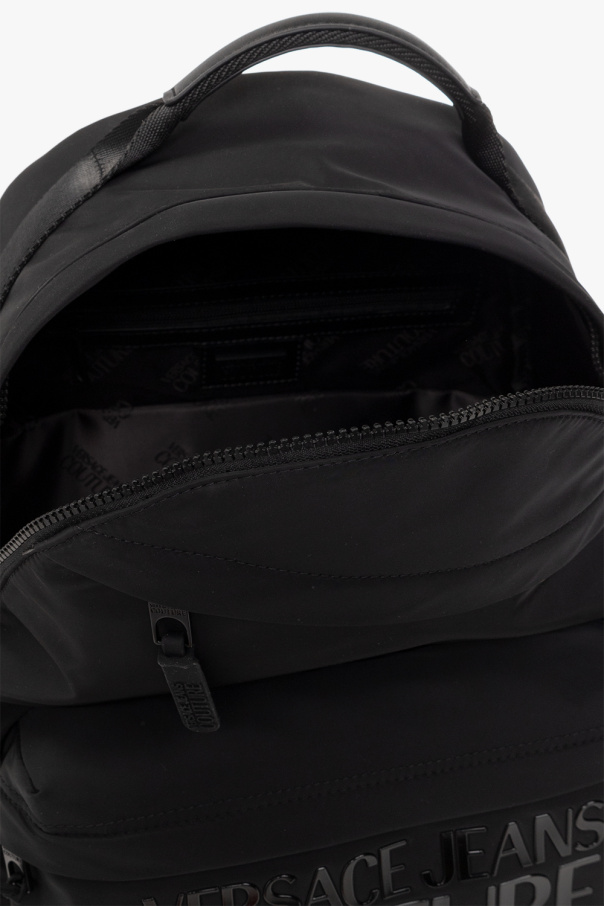 Black backpack from Versace Jeans Couture. Emblazoned with a rubber logo patch, this design features a two-way zip fastening, two zip pockets on the front, a top handle, adjustable shoulder straps and one internal compartment with two three pockets and one zip pocket.
