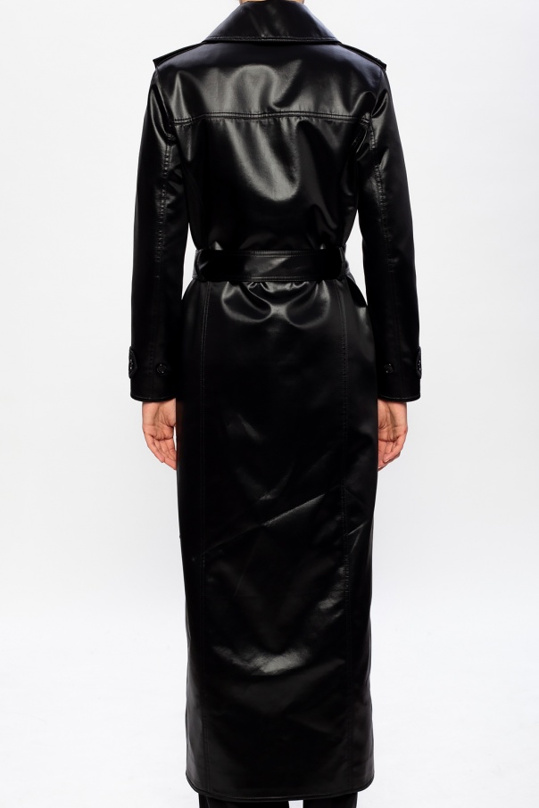 Black coat from Saint Laurent. Crafted from faux-leather, this long, double-breasted design fastens via buttons and employs two welt pockets on the sides and self-tie belt to accentuate the waist.