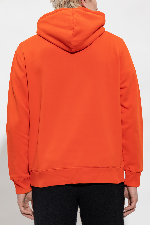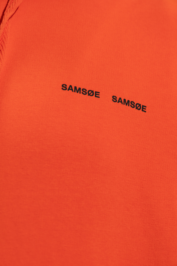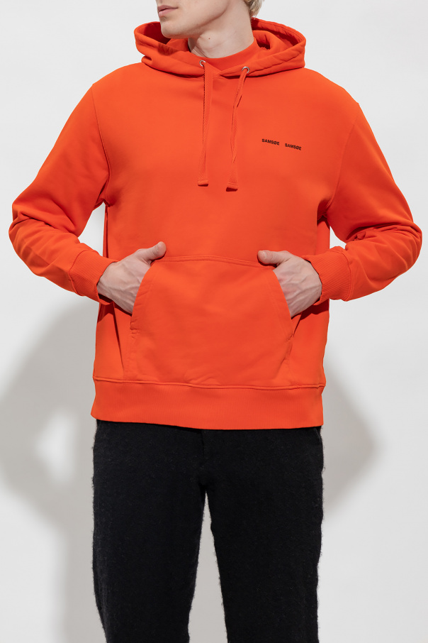Orange ‘Norsbro’ hoodie from Samsoe Samsoe. Crafted from organic cotton with the brand\'s signature GOTS certificate, this garment features a drawstring hood, black logo print, slip pocket and ribbed trims at the hem and cuffs.