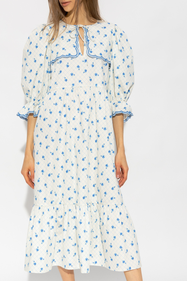 White and blue ‘Rose’ dress from Notes Du Nord. Crafted in cotton poplin, this style showcases a floral pattern, a tie neckline, a flared hem and blouson sleeves with elasticated cuffs and embroidered edges.