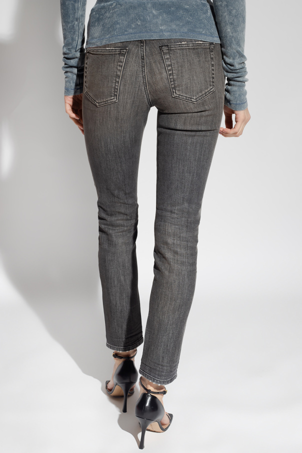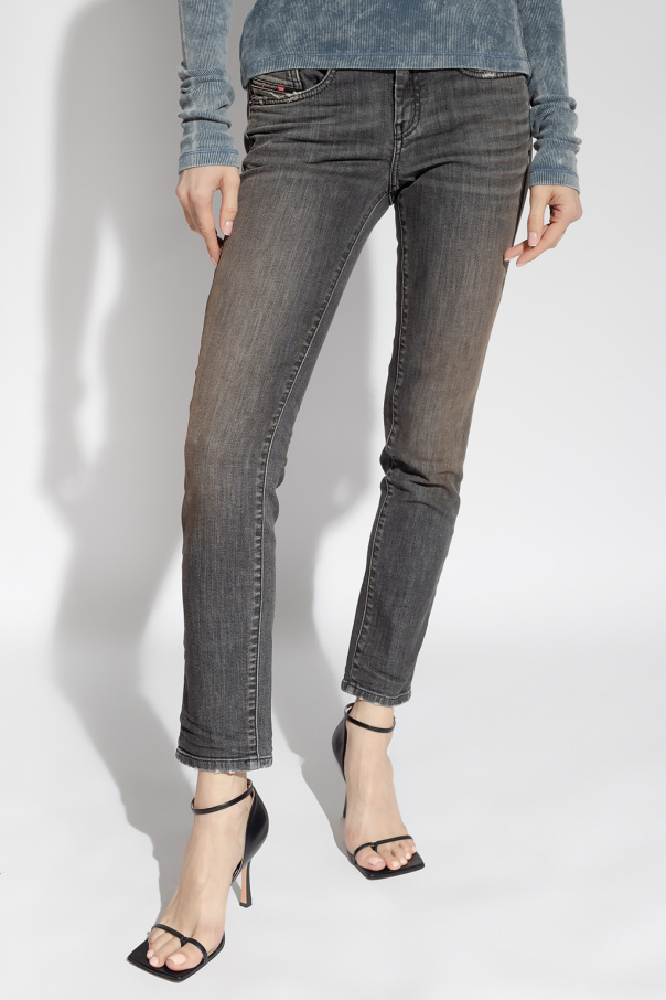 Dark grey \'D-OLLIES-T\' jeans from Diesel. Falling with tapered legs, this pair features a zip fly with a button, classic five pockets, a vintage effect and logo patches on the front and back.