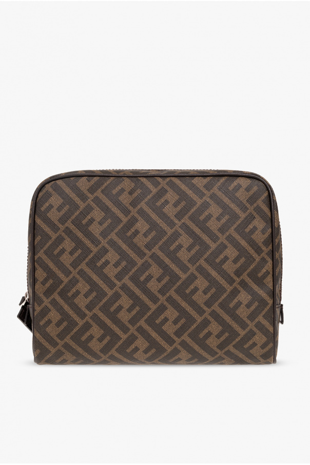 Brown wash bag from Fendi. Made of coated canvas with an FF monogram and calf leather trims, this model features a zip fastening with a logo-embossed charm, silver-tone metal hardware and one internal compartment with two slip pockets.