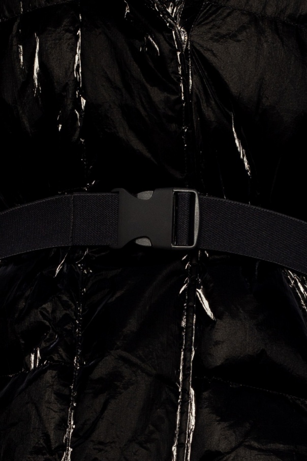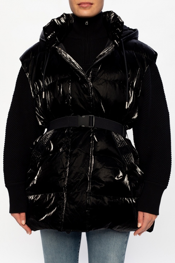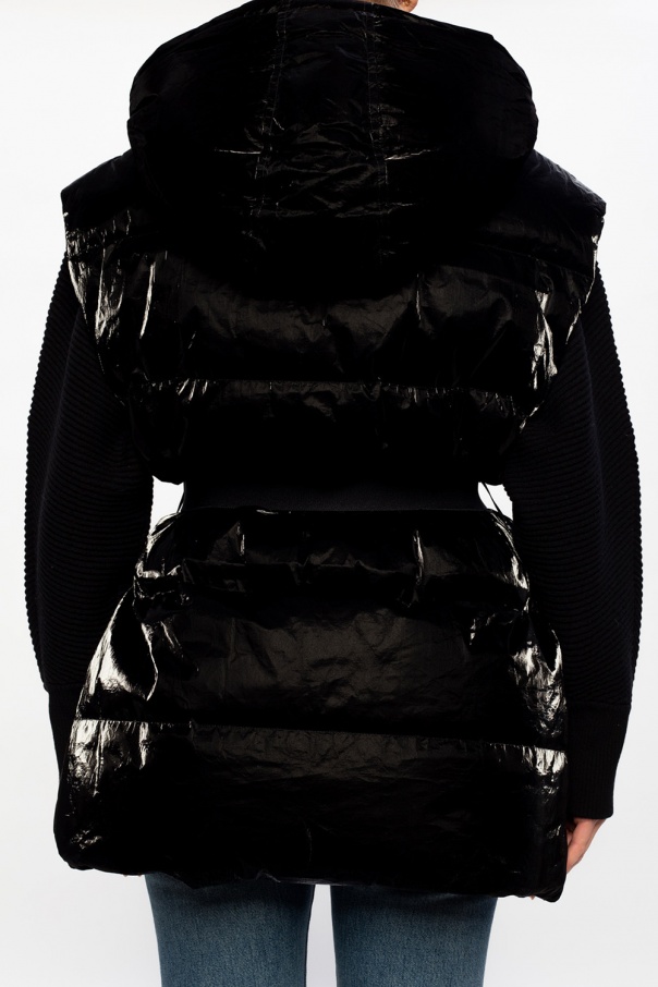 Black quilted vest from Diesel. Padded with down, this garment features zip, snap and velcro fastening, a double hood, two snap pockets on the front and a buckle belt at the waist.