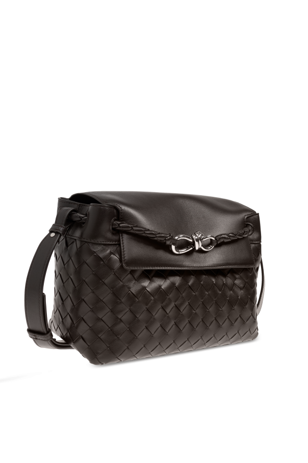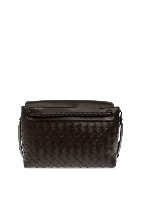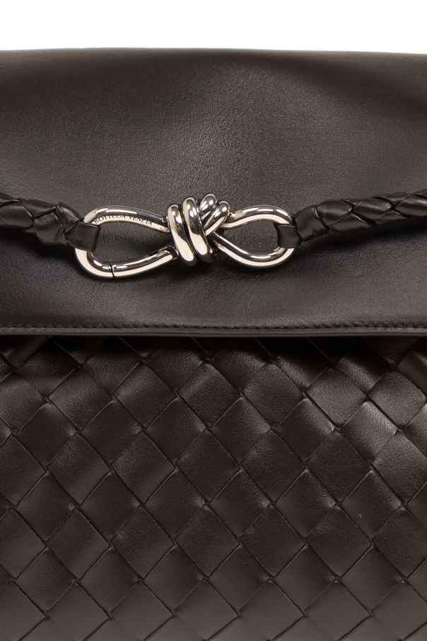 Introducing the exquisite Andiamo shoulder bag by the illustrious designer Bottega Veneta. Crafted from luxurious brown leather with an intricate woven pattern, this bag epitomizes sophistication and elegance. The rectangular silhouette is accentuated by a flap closure adorned with a silver knot-shaped clasp, adding a touch of character. The Andiamo bag features braided handles that seamlessly complement its overall design. Its interior is lined with a light fabric, offering a zippered pocket for enhanced organization. This spacious compartment is perfect for those who value both style and functionality. Why Choose This Product? Premium Material: Made from 100% genuine leather for a timeless appeal. Elegant Design: Unique woven pattern with a stylish silver clasp. Functional Interior: Includes a zippered pocket and slip pocket for organization. Heritage Brand: Designed by Bottega Veneta, a brand synonymous with luxury and innovation since 1966.