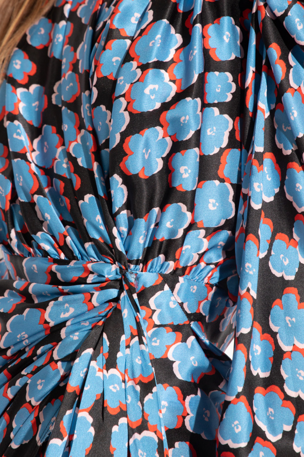 Multicolored asymmetric wrap-over dress from Lanvin. Crafted from silk, this design features a floral print, decorative gathers and ruffles, beige transparent mesh, raw cut edges and long puff sleeves with silver-tone buttons at the cuffs.