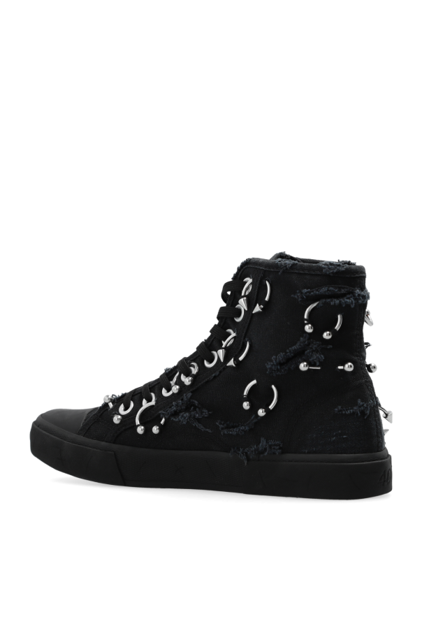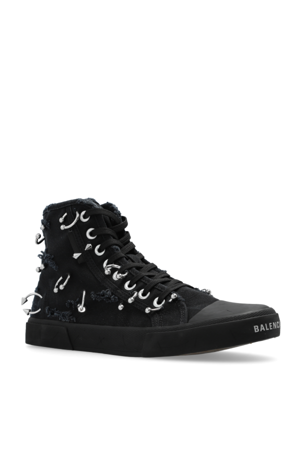 Black ‘Paris’ lace-up sneakers from Balenciaga. Made of fabric with a vintage effect, this model features a decorative appliqué in silver-tone and a black rubber sole.