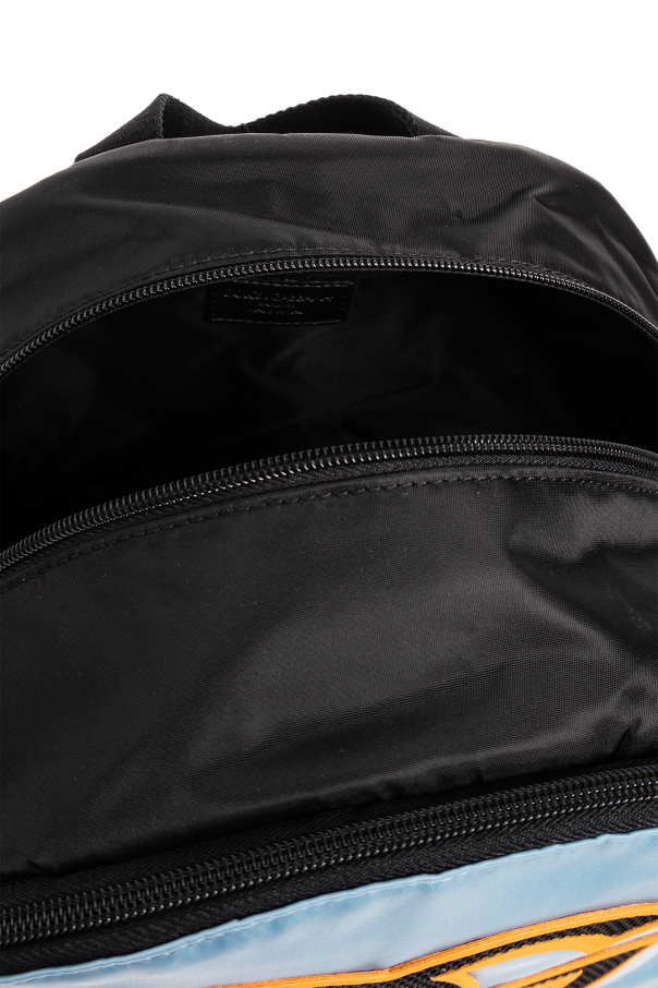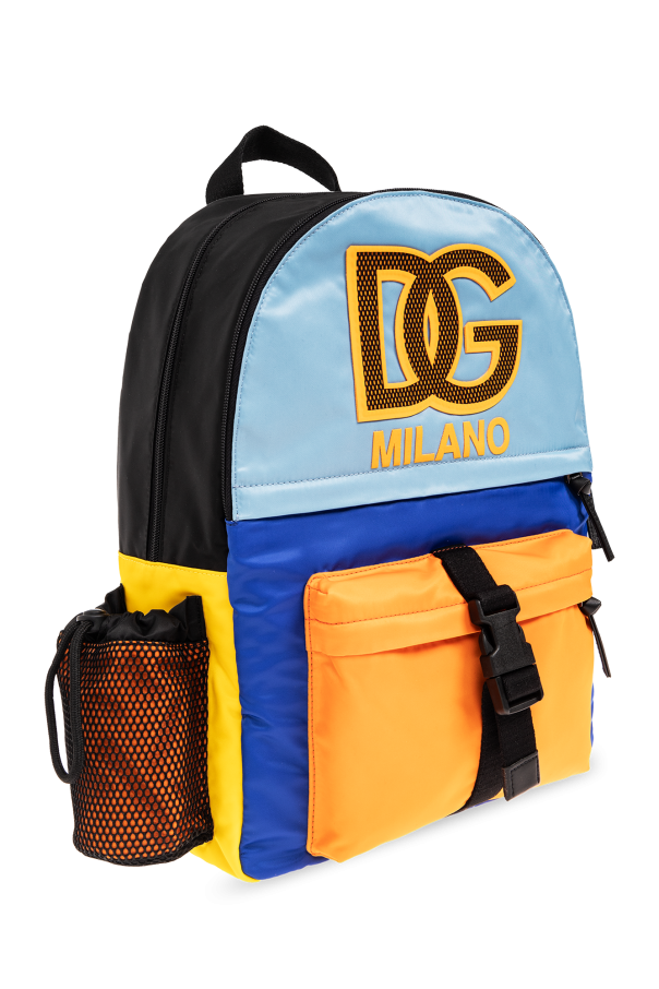 Multicoloured backpack from Dolce & Gabbana Kids. Emblazoned with logo-shaped patches on the front, this item fastens via a zip and features multiple pockets: a slip one, a couple of zipped ones and a drawstring one. It is complete with a card slot on the back, one half-round handle, adjustable shoulder straps, silver-tone metal hardware and one internal compartment with a slip pocket.