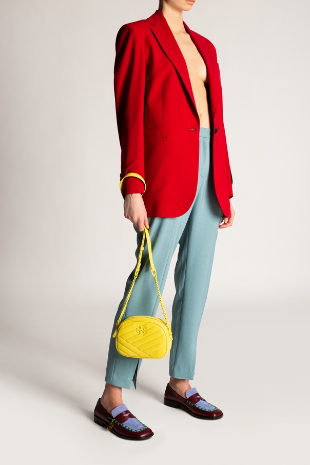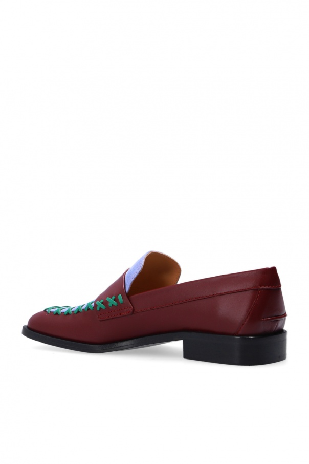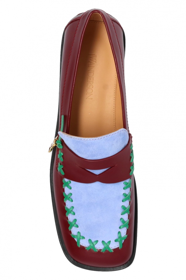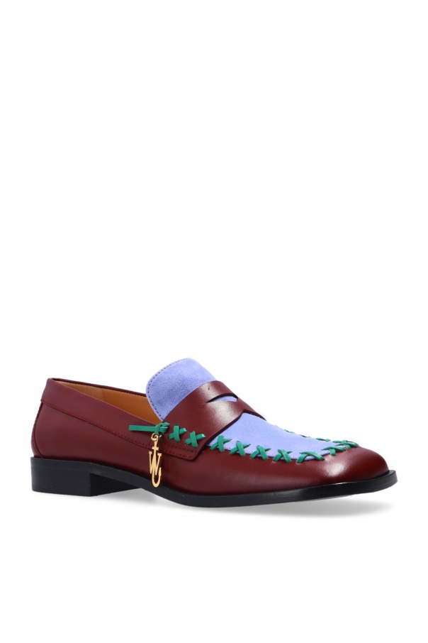 Maroon and green loafers from J.W. Anderson. Trimmed with blue suede, this design features a gold-tone logo element and black leather sole.