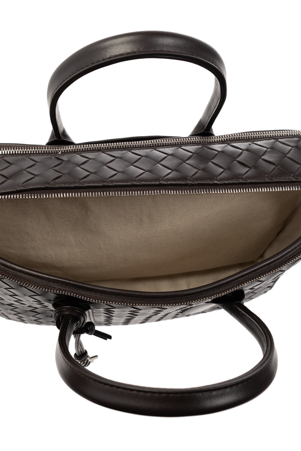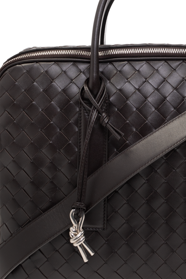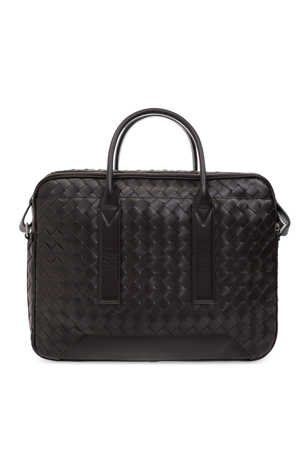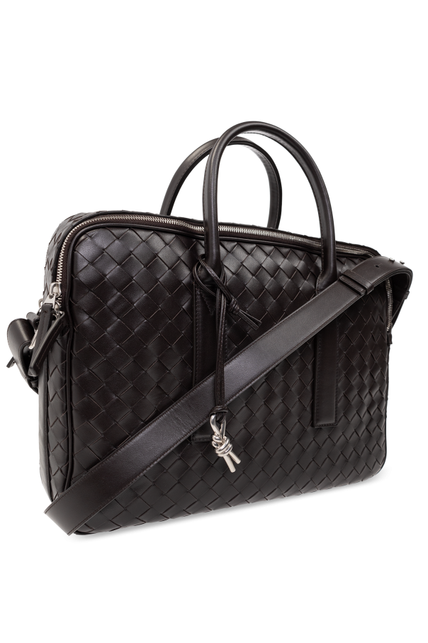 Dark brown ‘Avenue Medium’ briefcase from Bottega Veneta. Made from leather with the brand's signature ‘Intrecciato’ weave, this design secures with zip and showcases a signature knot-shaped charm on the front. It is complete with a detachable and adjustable shoulder strap, two half-round handles, two back slip pockets, silver-tone metal hardware and two separate compartments inside – one has one zip pocket, the other one houses two slip pockets.