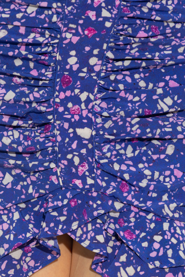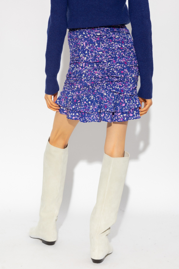 Purple ‘Milendi’ mini skirt from Isabel Marant. Made of silk, this design features a concealed side zip and hook, multicolored pattern, gathers and ruffle at the hem.
