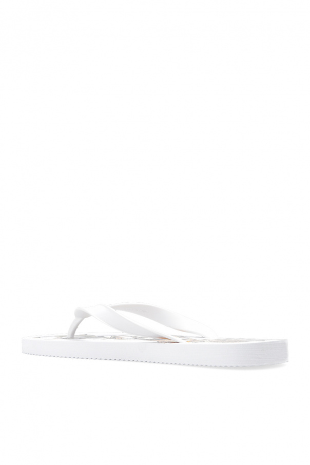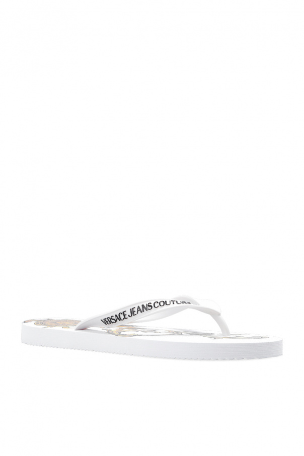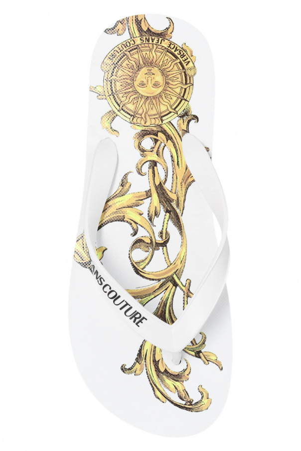 White slides from Versace Jeans Couture. Made of rubber, this pair features a black raised logo and Garland Sun print in orange, black and brown.