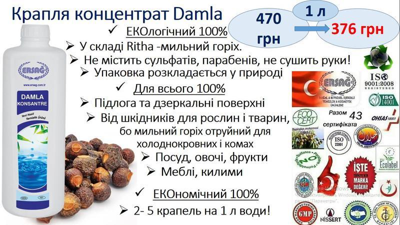 ЭКОлогичный и ЭКОномичный концентрат для уборки — Дамла Обычные средства для мытья посуды, чистки, отбеливания попадают в наше тело через кожу, еду или питье. И наносят непоправимый вред организму, особенно неокрепшему детскому. Некоторые ищут альтернативу опасной бытовой химии. А многие уже перешли на более безопасную ЭКО продукцию по уходу за телом и домом. К такой продукции относятся все средства компании Эрсаг на основе орехов мыльного дерева. Концентрированной КАПЛЕЙ можно мыть: жирную посуду; налет от заварки или кофе; мебель; зеркальные поверхности; кафель и покрытия из пластика; підлоги; фрукти та овочі; домашніх тварин; кімнатні рослини та городні культури. Дамлу по праву можна вважати унікальним і кращим ЕКО засобом. Його склад 100 % органічний і здатний гарантувати 100% чистоту Вашого будинку. Пояснюється такий ефект тим, що концентрат містить екстракт мильного горіха Ритхи, потужний миючий ефект якого забезпечують сапоніни природного походження. Сапоніни мильного дерева прекрасно піняться, розчиняють жири, видаляють бруд, мають поживні та пом'якшуючі властивості, не подразнюють шкіру. Спосіб застосування: Для очистки автомобилей, стекла, мебели и деревянных поверхностей достаточно добавить 2-3 капли чистящего средства на 1 литр воды. Нужно протереть загрязненную зону тряпкой или губкой, пропитанной водой с каплями концентрата. Для усиления эффекта вытереть насухо. Для мытья диванов и ковров на 1 литр воды 5 капель. Для удаления пятен с тканей и ковров, достаточно увлажнить пятно теплой водой и затем нанести наш продукт и протереть пятно. Рекомендации от Партнеров компании. 1. Ложки, вилки, ножи из нержавейки, мельхиора, серебра забрызгать концентратом и дать полежать 3-5 минут. Потом протереть мочалкой и ополоснуть. 2. Дамла любит горячую воду (сапонины работают от 50 градусов и выше). 3. Пятна на футболках, свитерах, белье забрызгать концентратом и положить в стиральную машинку. 4. Ковер и обивку мебели чистят салфеткой, смоченной в водном растворе концентрата, меняя воду по мере ее загрязнения 0,5 л стоит 453 грн, можно приобрести с 20% скидкой за 362 грн.Обращайтесь - расскажу как это сделать. Я відсилаю річ після передоплати на мою карту Приват або вартість речі, або вартість ПЕРЕСИЛАННЯ в дві сторони.Состояние: НовоеЦвет:- Разноцветный
