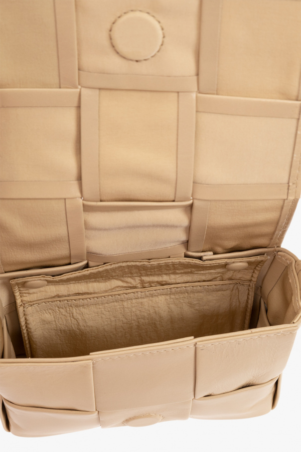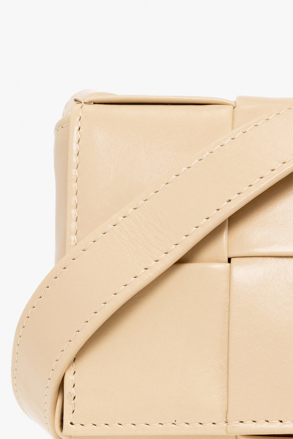 Beige ‘Candy Cassette Mini’ shoulder bag from Bottega Veneta. Crafted from polished calf leather accentuated with the brand's signature Intreccio weave, this design features a magnetic fastener, an adjustable shoulder strap, silver-tone metal hardware and one internal compartment with a card slot.
