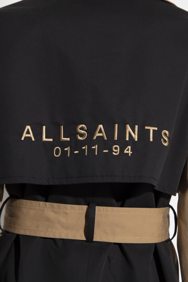 Brown and black ‘Mixie’ double-breasted trench coat from AllSaints. Crafted from organic cotton, this style fastens with buttons and features a waist-cinching tie belt, storm flap, back logo embroidery, two slip pockets, a single back vent and long sleeves with button straps on the cuffs.