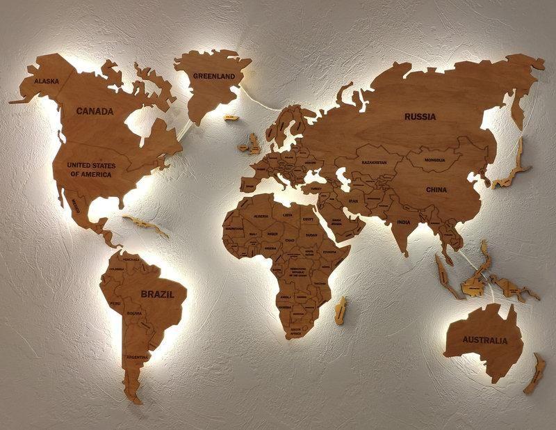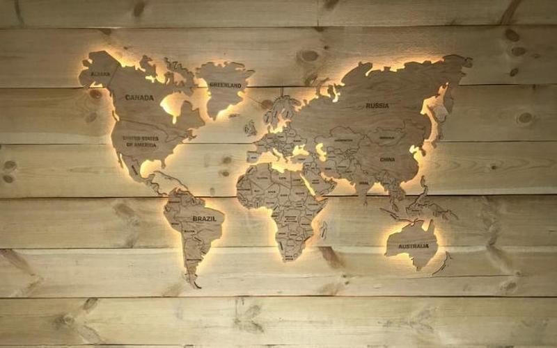Деревянная карта Мира-это отличное дополнение Вашему интерьеру, как для офиса, так и для дома. LED подсветка добавляет интерьеру немного волшебства и уюта.