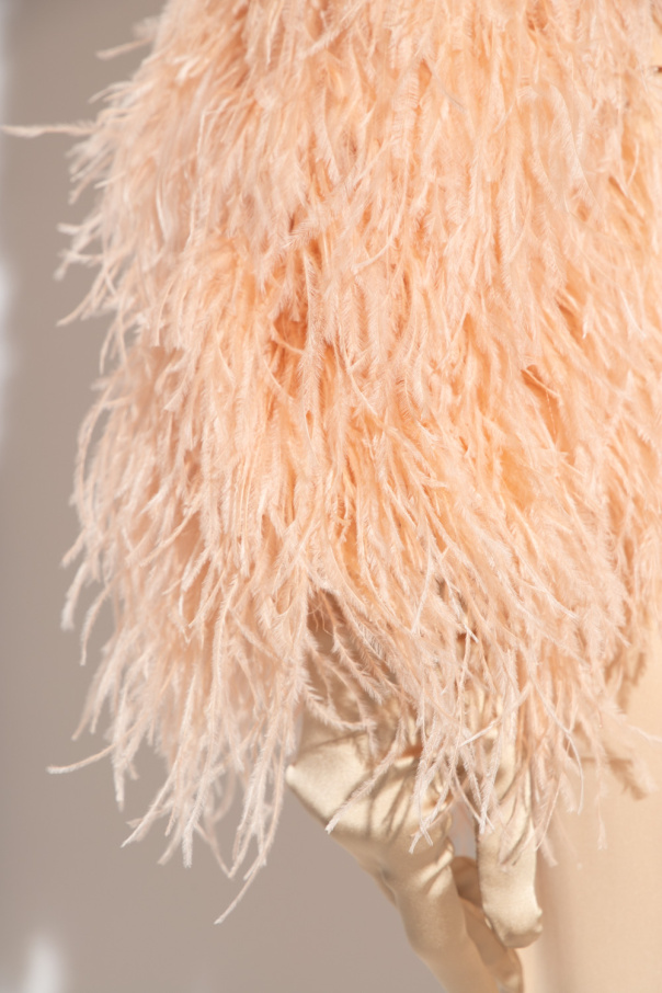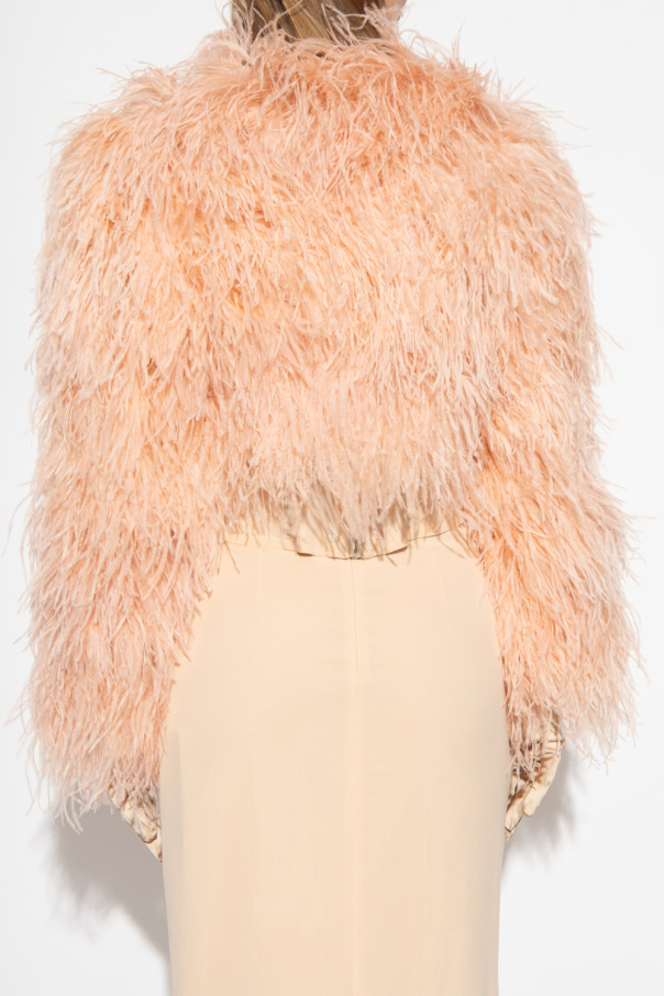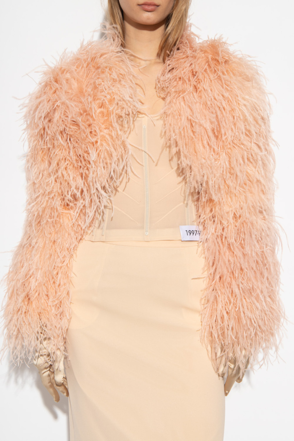 Pink jacket from Dolce & Gabbana x Kim. Made of silk and completely covered with ostrich feathers, this style features a cropped fir and long sleeves.