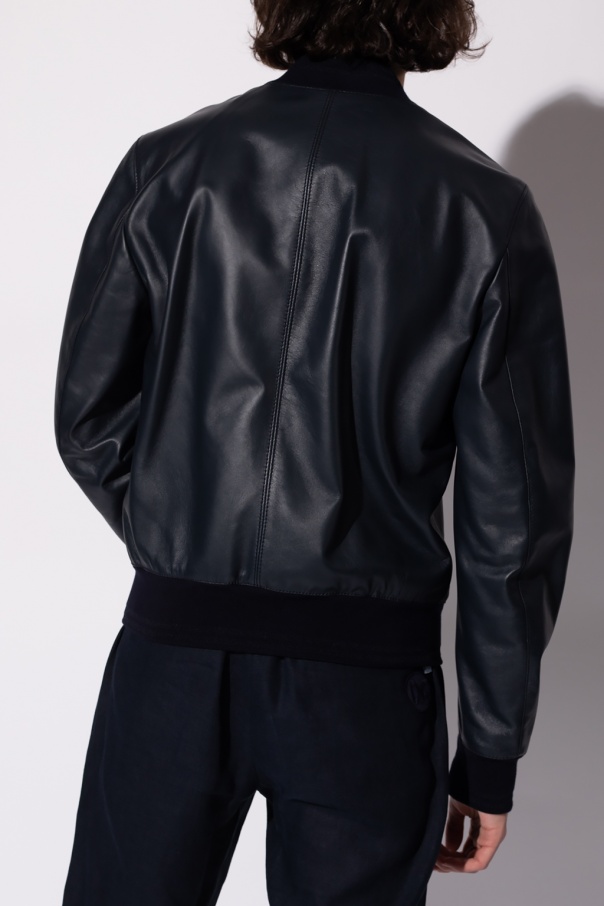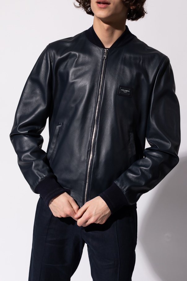 Navy bomber jacket from Dolce & Gabbana. Made of lamb leather, this design features a zip fastening, sewn-on logo appliqué, two front zip pockets and ribbed trims at the hem and cuffs.