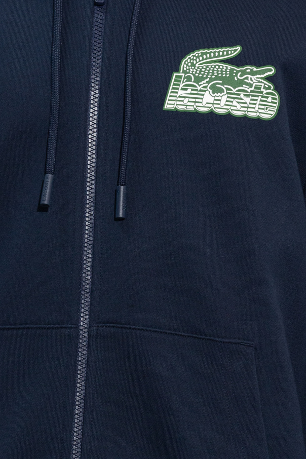 Navy blue sweatshirt with a drawcord-adjustable hood from Lacoste. Crafted from organic cotton, this style fastens with a zip and features a green and white graphic print with the brand\'s logo on the front, two slip pockets and ribbed trims on the bottom hem and cuffs.