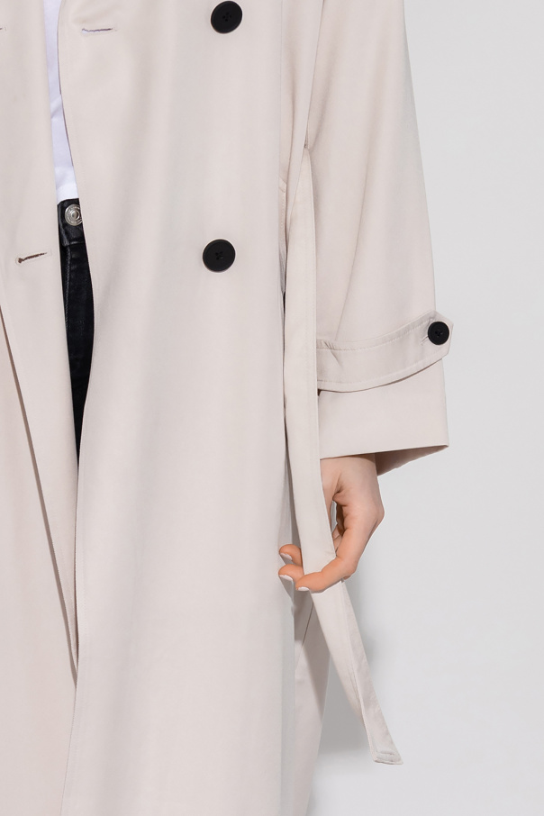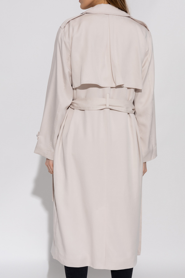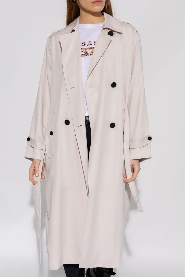 Cream ‘Suze’ trench coat from AllSaints. Made of Tencel™, a 100% natural wood-based cellulosic fiber, this garment features black buttons with a matte finish, two buttoned front pockets, tie waist belt, epaulettes and buttoned tabs at the sleeves.