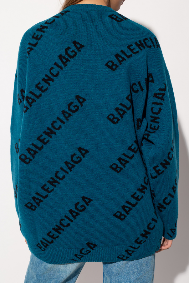Blue crewneck sweater from Balenciaga. Crafted from wool, this style features long sleeves and an embroidered black logo.