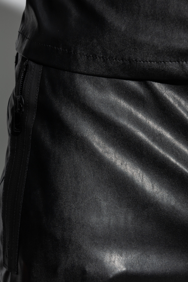 Black ‘P-Nes’ trousers from Diesel. Crafted from stretchy faux leather, this pair falls with straight legs and features a zip fly with a snap and four zip pockets throughout.