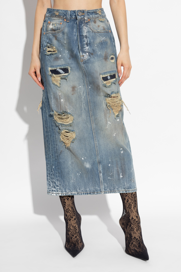 Introducing the Denim Skirt from the exclusive VETEMENTS collection, an epitome of fashion-forward elegance and rugged charm. This mid-length skirt, crafted from pure denim, exudes a classic yet modern aesthetic. The skirt features a mid-length cut that gracefully reaches mid-calf, offering a timeless silhouette. The distressed design, characterized by artful frays and tears, imparts a vintage allure, enhanced by deliberate wear-and-tear marks that evoke an authentic worn-in look. Functionality meets style with its classic front and back pockets, complemented by a secure button and zipper closure. The addition of metal rivets at the pockets not only reinforces durability but also adds a touch of industrial chic. The prominent, wide stitching further accentuates the skirt\'s structural integrity and visual appeal. Impeccably styled with a matching denim shirt and high-heeled boots, this skirt is a versatile piece that seamlessly blends classic and contemporary fashion. Why You Should Buy This Product Exclusive design by the renowned VETEMENTS group. Crafted from high-quality denim for lasting wear. Unique distressed and worn-in detailing for a vintage look. Functional design with classic pockets and durable metal rivets. Mid-length cut offers a timeless and versatile silhouette.