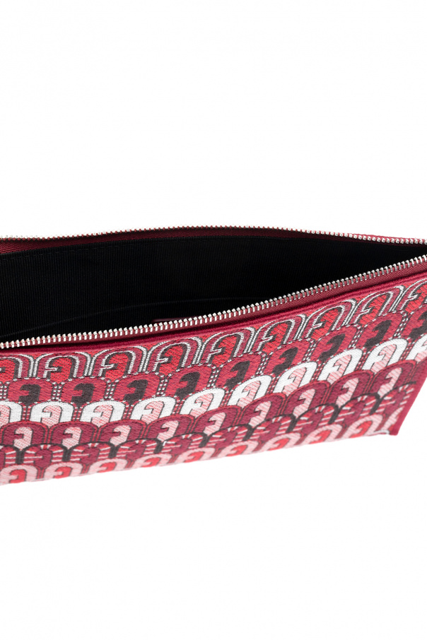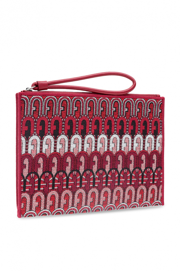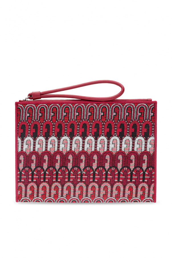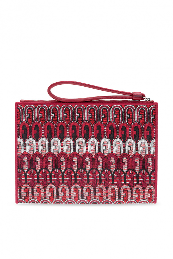 Maroon, black and white ‘Opportunity’ hand bag from Furla. Fastened with a zip, this design features an embossed jacquard logo, leather wrist strap, silver-tone metal hardware and one internal compartment with one slip pocket.