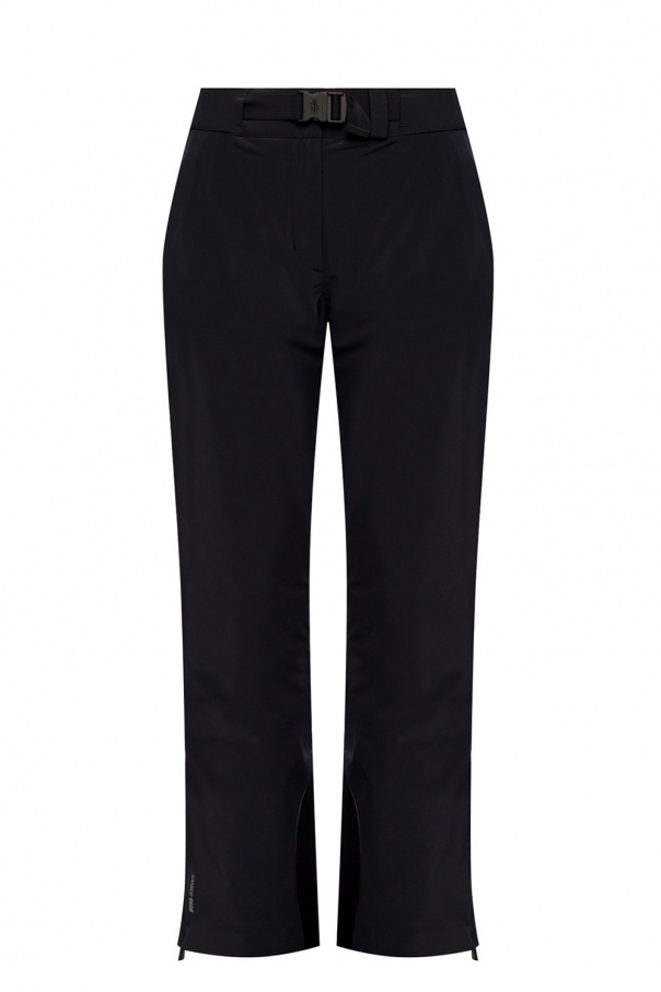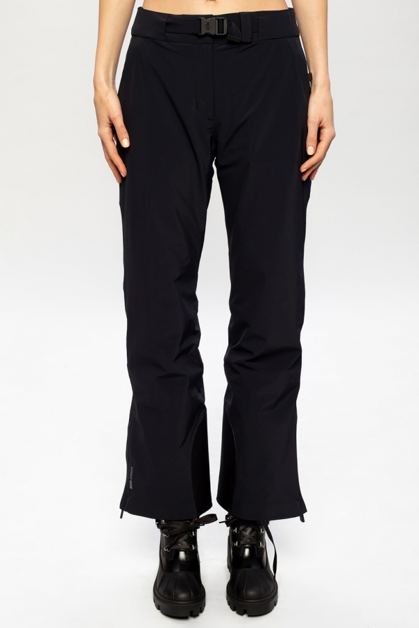 Black ski trousers from Moncler Grenoble. Crafted from GORE-TEX – a waterproof and breathable fabric membrane, this functional pair fastens via zip and snap-button closures and employs two zipped pockets and two-layered, flared legs with elastic cuff and ankle zips, suitable for ski boots. This item was equipped with embedded RECCO reflector, which offers an advanced avalanche emergency factor.