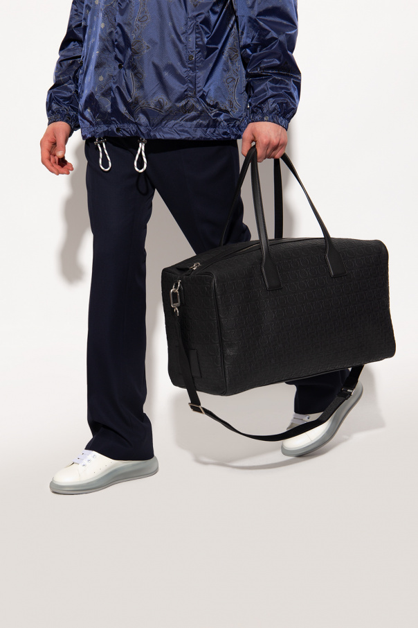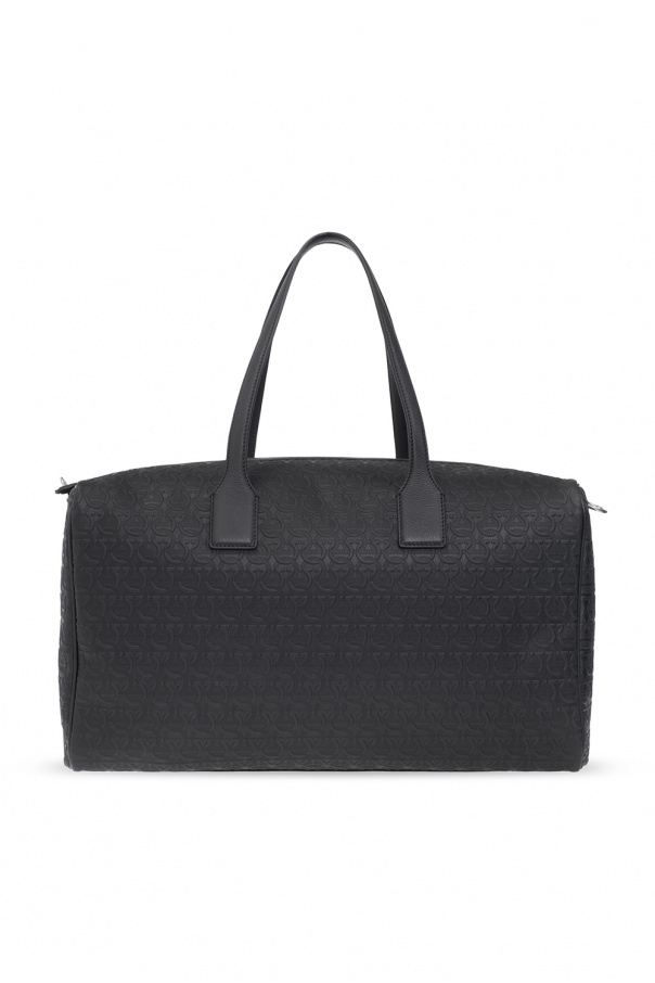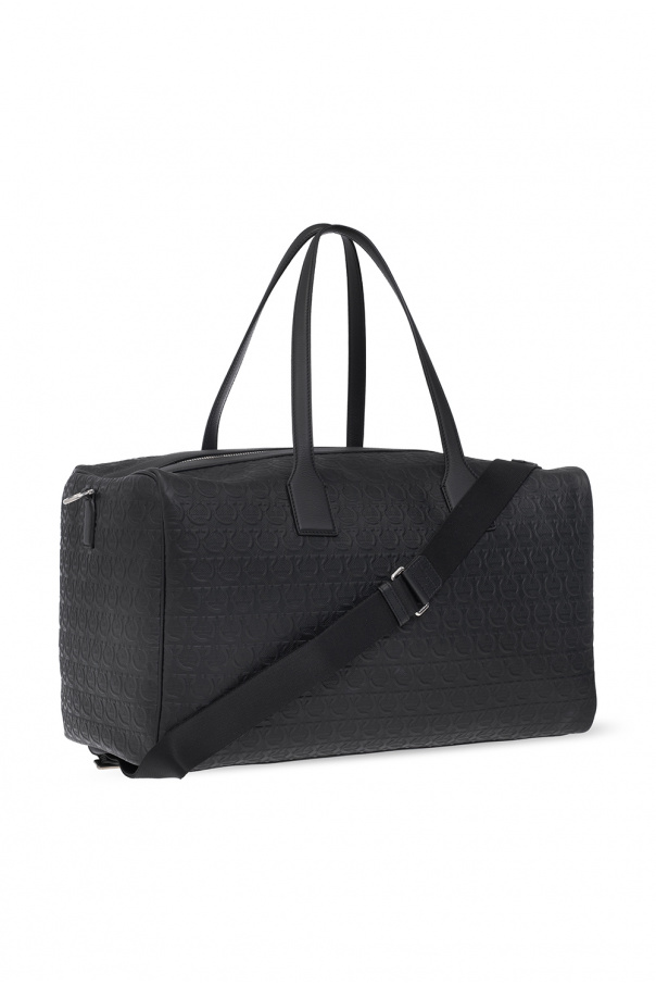 Black holdall from Salvatore Ferragamo. Crafted from calf leather embossed with the brand\'s iconic Gancini motif, this design features a zip fastening, two half-round handles, a detachable and adjustable shoulder strap, silver-tone metal hardware and one internal compartment with a zip pocket.