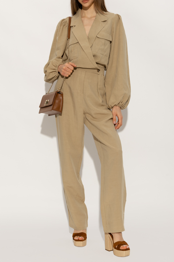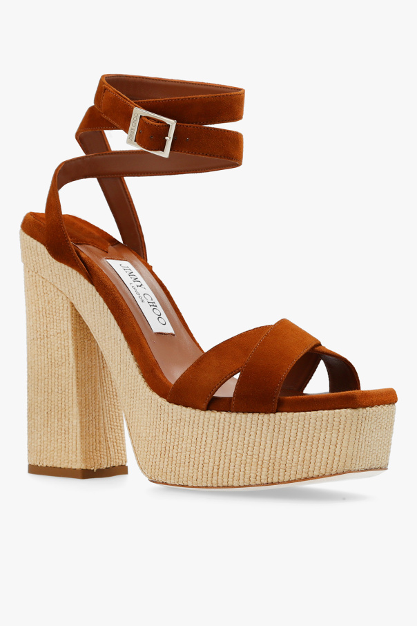 Brown ‘Gaia’ platform sandals from Jimmy Choo. Made of suede with a square toe, this model sits on a cream leather sole and features an adjustable strap at the ankle, crisscross straps on the front and woven raffia detailing on the beige platform and heel.