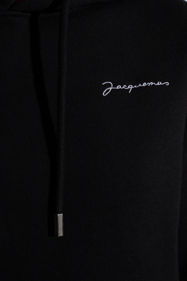 Black ‘Brode’ sweatshirt with a drawstring hood from Jacquemus. Made of cotton, this style showcases a kangaroo pocket accompanied by white logo embroidery on the front, long sleeves and ribbed trims on the bottom hem and cuffs.