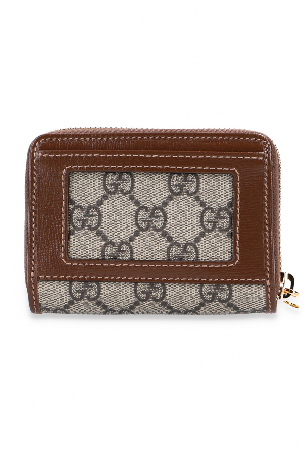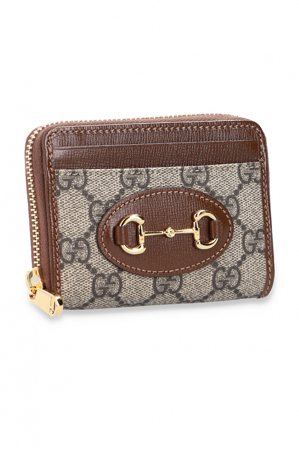 Brown and beige ‘Horsebit 1955’ wallet from Gucci. Made of the brand’s signature ‘GG Supreme’ canvas with leather trims, this design features a zip fastening, logo pattern, three card slots, the iconic horsebit and gold-tone metal hardware. It has a coin pocket and four card slots inside.